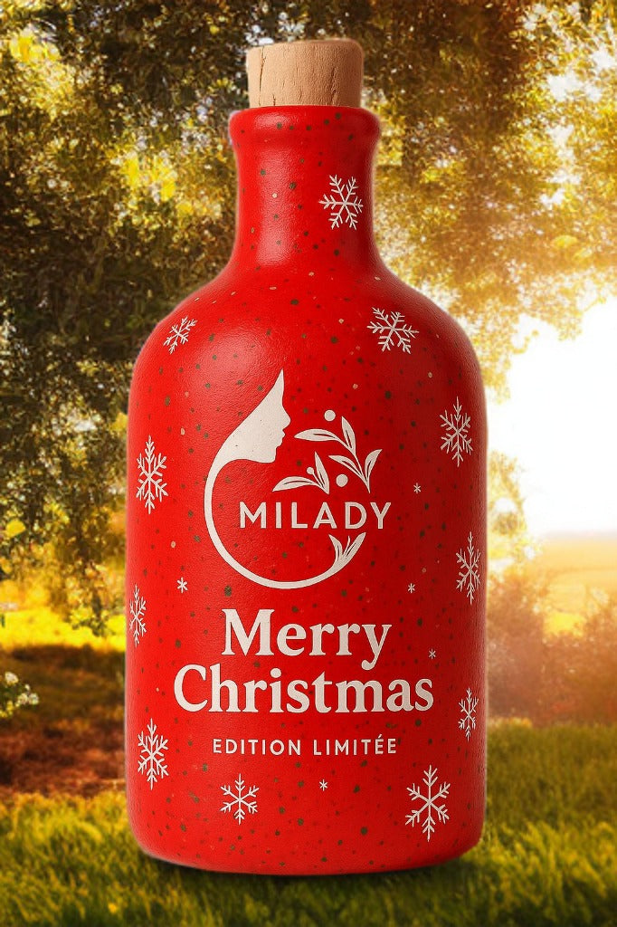 Celebrate the magic of the holidays with the MILADY™ Merry Christmas Limited Edition. A festive, hand-decorated red bottle released in small batches, filled with our premium extra virgin olive oil from 100-year-old Tunisian olive trees—a refined and meaningful gourmet gift.